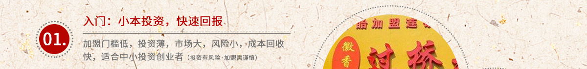 徽香园·过桥米线 品牌介绍 徽香园过桥米线餐饮连锁经营有限公司于2003年成立于安徽蒙城,历经多年的市场洗礼,徽香园过桥米线实现了跨地区经营,磨砺出一支成熟的管理团队,同时以完善的服务与顾客的好评,创造了良好的经济效益和社会声誉。 蒙城县徽...